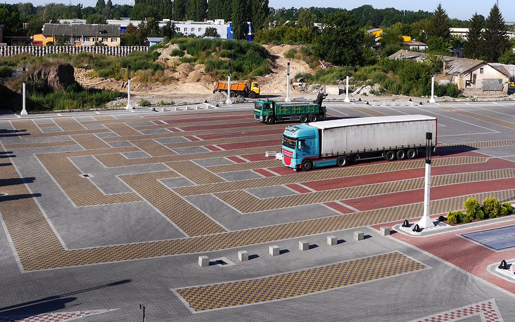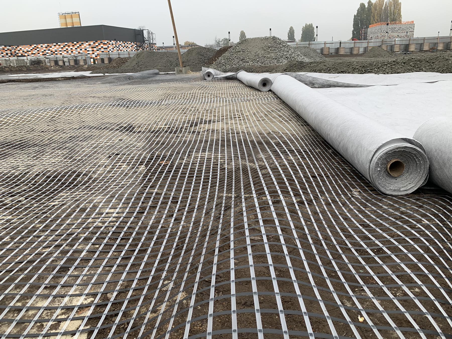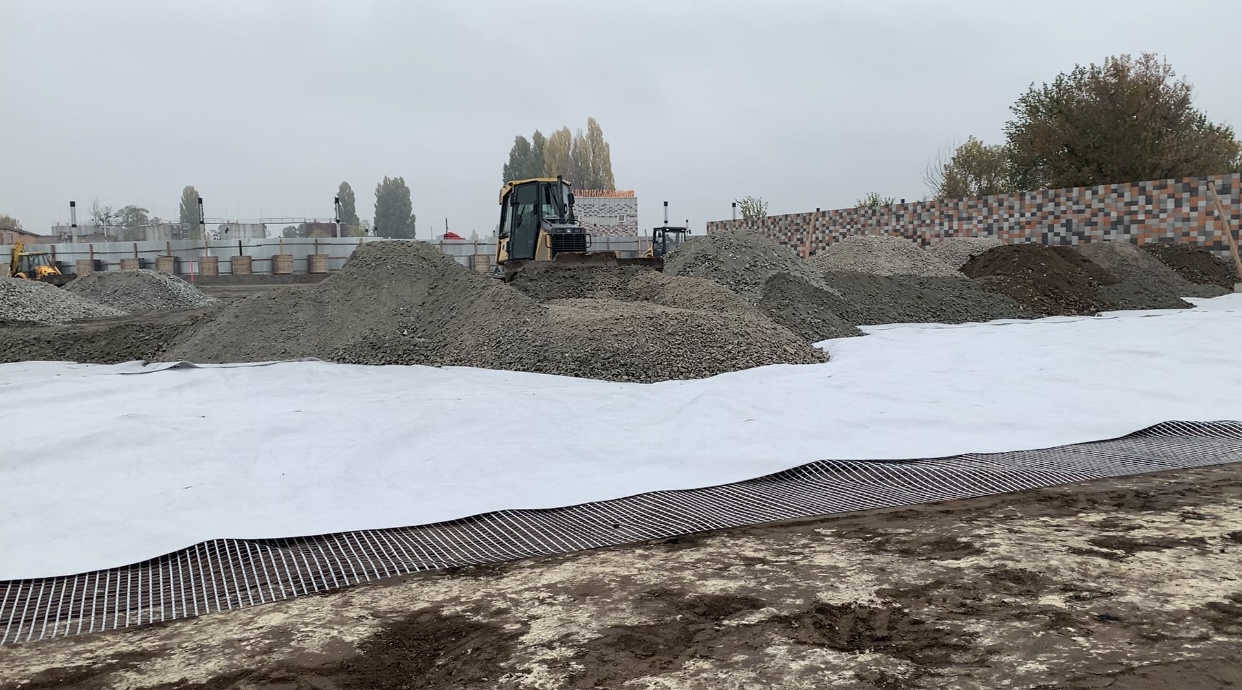 Будівництво заводу бетонних виробів в м. Обухів, Київська обл. Складські території та під’їзні дороги для вантажного транспорту. Зміцнення шарів ґрунту, з подальшим вкладанням плитки ФЕМ. В якості армуючого матеріалу використана зварна поліпропіленова георешітка 30/30 кН/м. В якості фільтруючого прошарку використаний поліпропіленовий термоскріплений геотекстиль 150 г/м2.